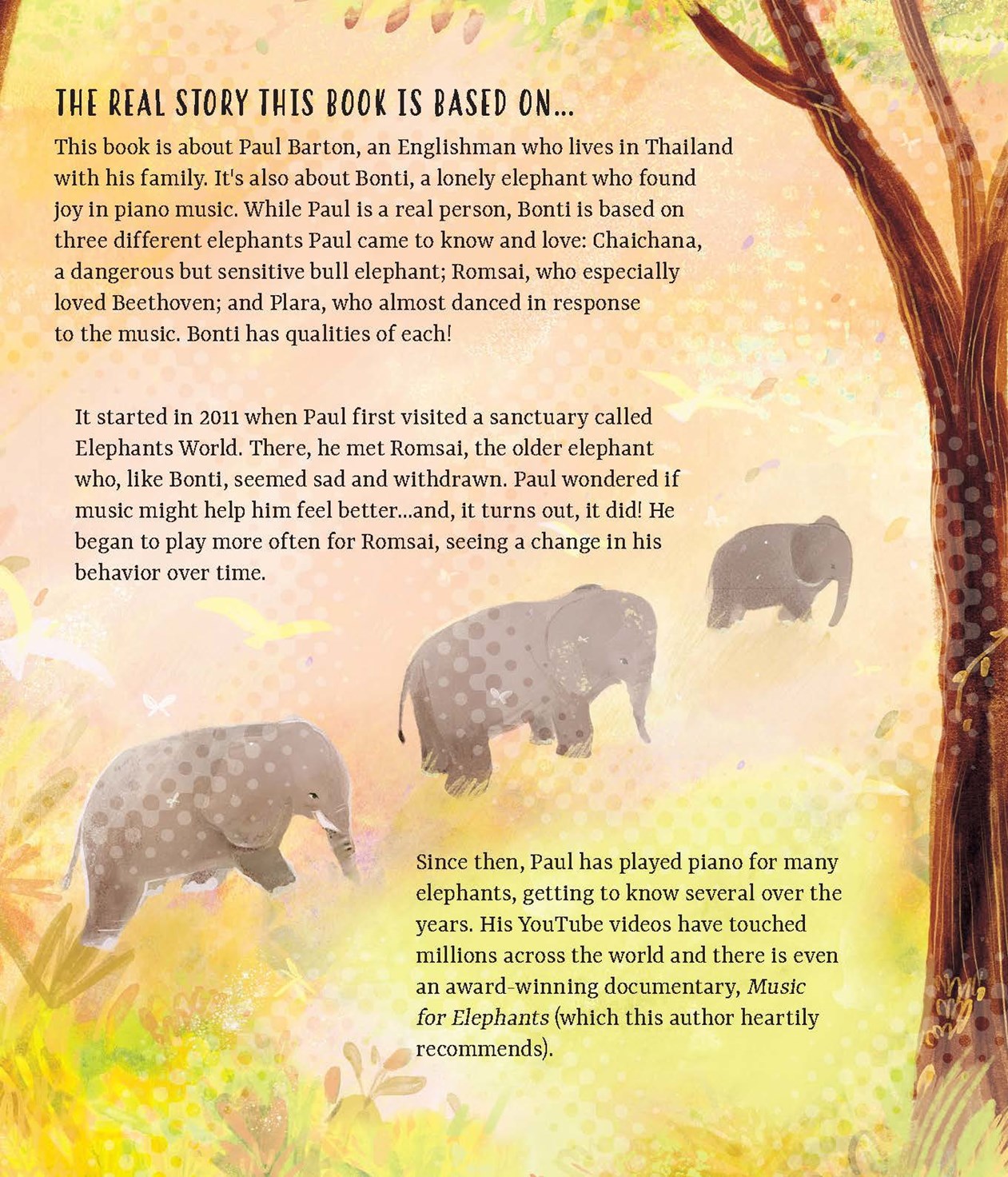This book is based on actual events (but takes some poetic license) of how one man decided to help an elephant in a sanctuary by playing music to him (and eventually) the rest of the herd. He physically takes his piano into the area, plays and the elephant who was a loner and more than a bit wild (and a baby elephant) listen, play (the piano) and dance along with him. And then things go from there and a lot of fun (and history) ensues.