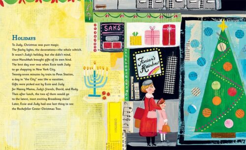 The artwork is bold, bright and yet has a softness that captures the essence of the time and person. Judy was known for being the “good girl” and the images are reminiscent of the 1940s and 1950s (her childhood years) but also are modernly touched. There is an energy to text and art, but the text really pops off the page. The collage look and probably a few mixed medias all come together to make a bold statement.