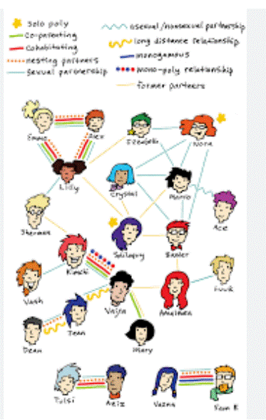 However, though monogamous people can read to learn, I think the best audience are adults who are in polyamours relationships. Still, anyone will see that relationships are relationships and there are funny and not so funny moments; there are times when our jealousy gets the best of us and sometimes we don’t practice what we preach. There is a map of who is with whom and names, but that was confusing for me….. Lots of lines and lots of in and outs! Also included are a few terms you might find in the community such as cowboys and cowgirls, names of different types of relationship dynamics and how to balance children/family and your non-biological partners. The section I was curious about was how Ace fits in (they are asexual) and now want to know about them. This is because I know little on the subject, am curious how they fit in as a partner and since one of the characters (who just happens to be a trans woman) has one of the most honest reactions to him.